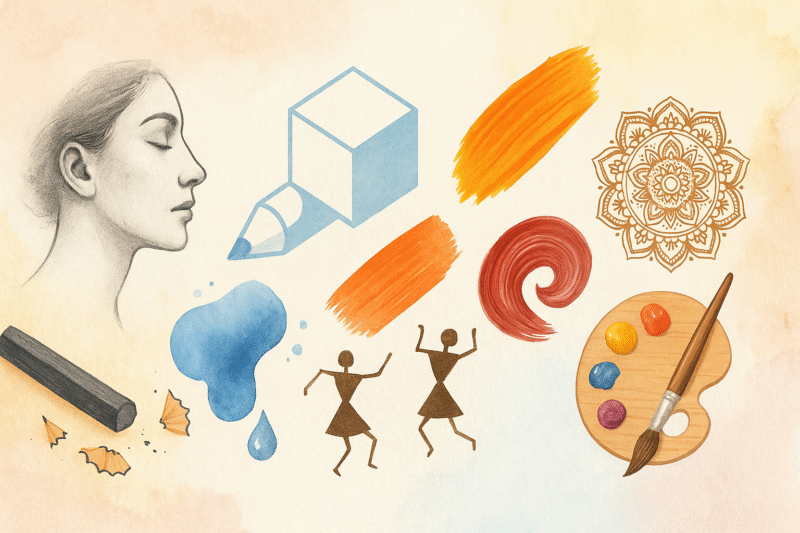 Spark creativity with drawing, painting, embroidery, paper craft, calligraphy, murals, crochet & more at Kanchi Kala Classes—guided by Mrs. Ranjana Doshi.